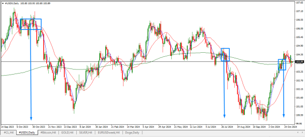 欢迎来到今天的实时交易时段!我们将深入探讨美元指数的近期表现及其趋势如何影响黄金走势。昨天,美元指数收盘下跌,从 103.95 跌至 103.50 水平。虽然它试图测试 103.95 阻力位,但未能突破,导致其趋势不确定。然而,美元指数的这种不稳定性正在增强黄金的看涨势头。