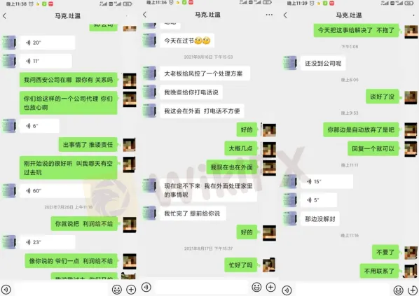 来自香港的天眼用户ID FX3108255373投诉表示,自己2021年就使用morningfx做交易了,之前盈利就是一直拖延出金,后面在网络上各种举报morningfx,morningfx就派了个客服,一直说沟通,一直沟通到现在,期间谈成了一些条件,也让步出金只拿盈利的60%,本来以为谈好了,但每次等到即将出金的时候,这个客服就会找理由拖延出金,不是公司老板不在,就是风控不在,过了段时间又说正在和朋友吃饭晚点说,总之就是有各种理由,直到现在也没有要出金的意思,这个平台就是辣鸡平台。